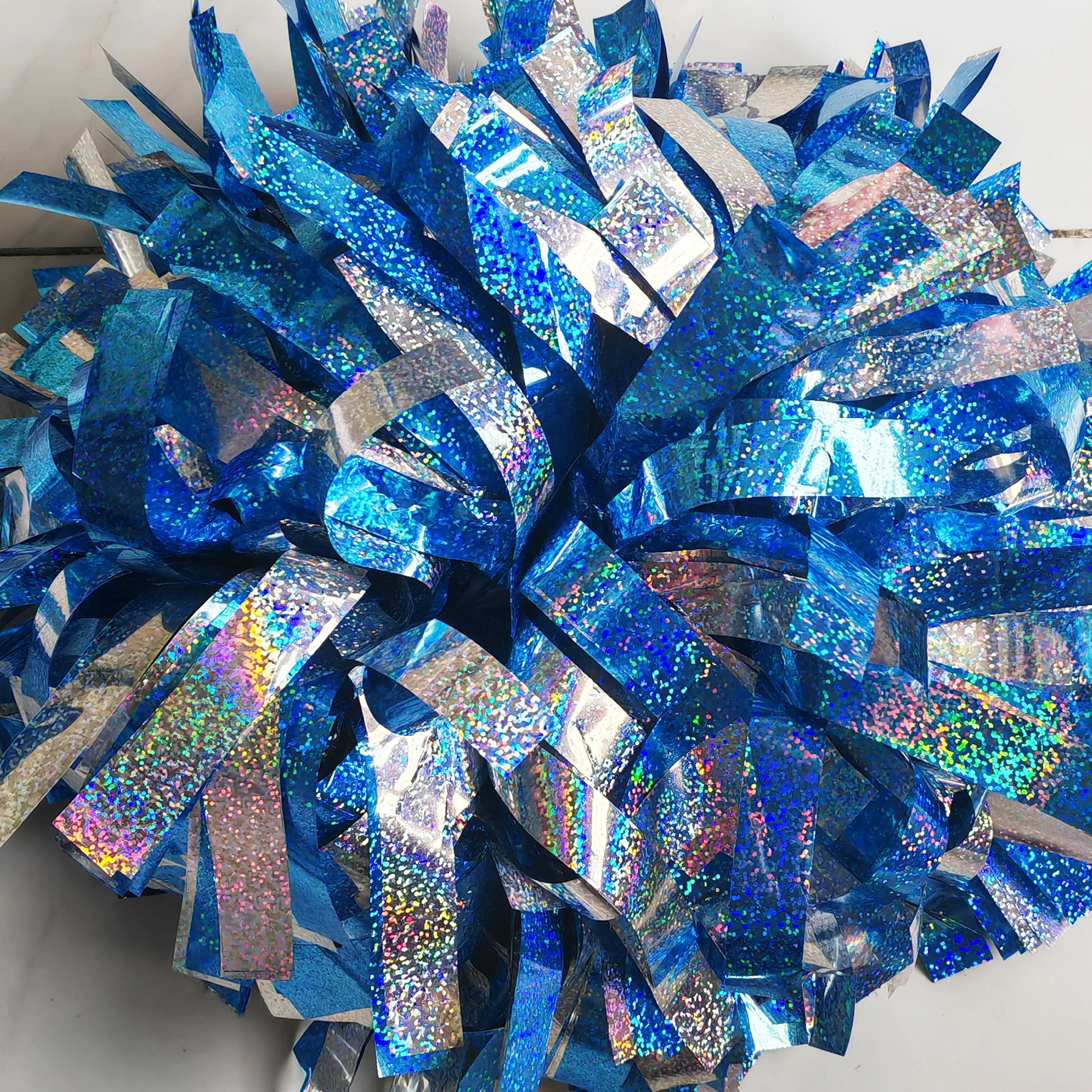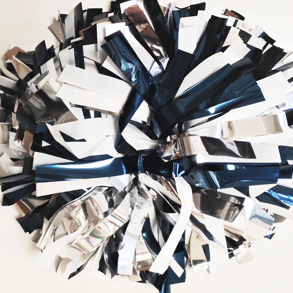 Get the crowd going with this metallic white, light blue, and black cheerleader pom pom. Customizable in size and color, featuring a sturdy baton handle for easy use. Perfect for adding flair to your cheer routine or sports event.